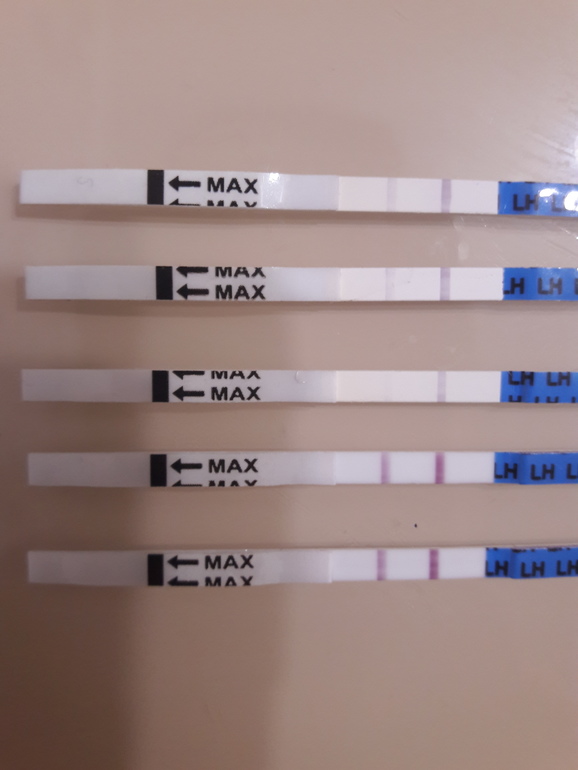 Овуляция( тесты на овуляцию)В прошлый месяц цикл был 32 дня. В этом месяце начала мочить тест с 16 дня. Вижу не ярчает полоска. Сейчас сделала аж 2 подряд (сегодня 19дц!!) И ничего не пойму? Они одинаковы? Или завтра ярче будет? Тест "я родился". Напишите,девчат, свое мнение.