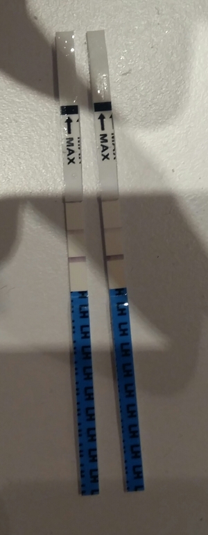 На фото это тоже отрицательный тест.Положительный это когда полоски одинаковые и после него О наступает через 24-36 часов обычно.