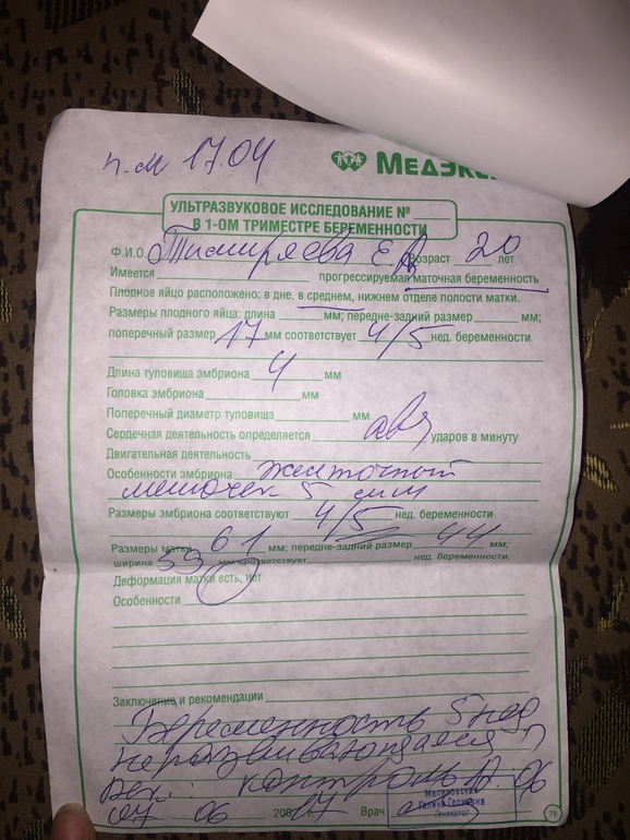 Беременность- 1 триместр ( только до 10 недель)Последние месячные были 17 апреля. Овуляция предположительно была поздняя. Где то 3 мая. 15 мая пошла на УЗИ. Поставили беременность под вопросом со сроком 3,5-4 недели. На УЗИ была маленькая бусинка. 30 мая пошли желтые выделения и я вызвала скорую. Положили на сохранение. На следующий день сделали УЗИ. Там поставили срок 4-5 недель, но ни эмбриона ни сердцебиения не увидели. Нашли желточный мешочек и плодное яйцо. Врач сказала переделать УЗИ ровно через неделю, тоесть сегодня. Сделали. Врач сказал что все равно ничего не видит. Но подрости УЗИ подросло. Я не одумываясь решила ехать в платную клинику.там эмбрион нашли, н сердцебиения не увидели. Сказали что скорее всего зб. Но лучше через неделю ещё раз сделать УЗИ.Смысл в том что в стационаре даже эмбриона не нашли, а в платной увидели. Мб не все потеряно. Подскажите у кого походие истории есть. Кстати сразу же после платной клиники пошла в свою больницу и написала откпзную. Так там медсестра такой скандал устроила..ужас. Решила завтра в женскую консультацию идти. Там все обьяснить и там уже пусть на хгч в динамике отправят. На фото сердечками отмечено когда был па. И сегодняшнее УЗИ