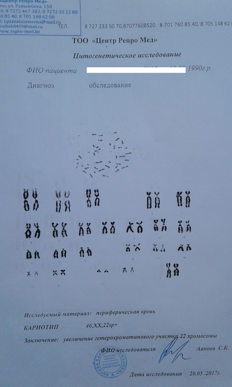 Результат супруга - 46 XY. Мой 46 XX, 22 sp+ увеличение гетерохромативного участка 22 хромосомы.