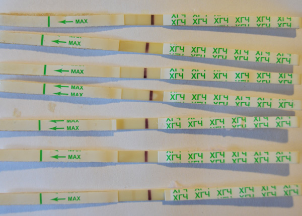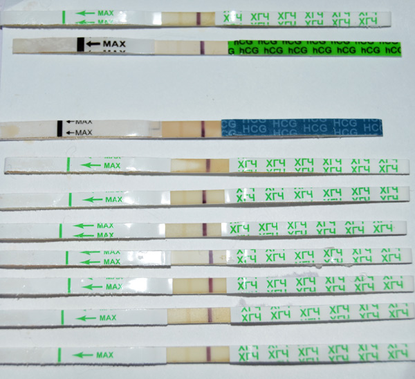 Видите тут 4 полосатых теста и 3 пустых. Сразу в голову закралась мысль, а вдруг те полоски, что окрасились были беременные. Замочила еще