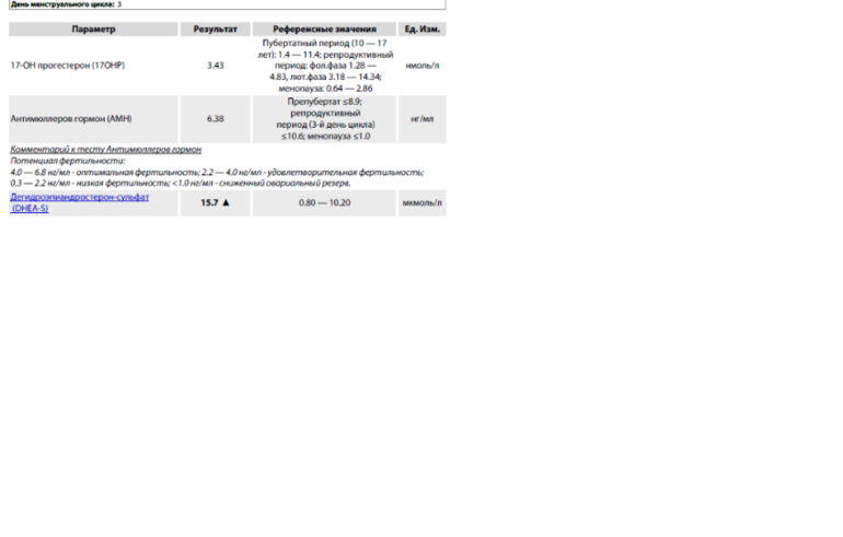 Была на приеме у гинеколога-эндокринолога, она прописала пересдать пролактин (пересдала, вписалась в норму), на 3 мес. иноферт + гормель 10 кап. с 5 по 15 ДЦ+утрожестан 200 с 17 по 26 ДЦ. Через 2 мес. приема перестала ДГЭА-С, 17-ОП, андростендион.