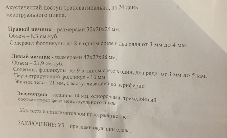 4)овуляция своя(опять в этот цикл делала фолликулометрию - даже 2 созрело ,тольколопнул 1;желтое тело на 24 дц,т.е.на 9-10 дпо 21 мм