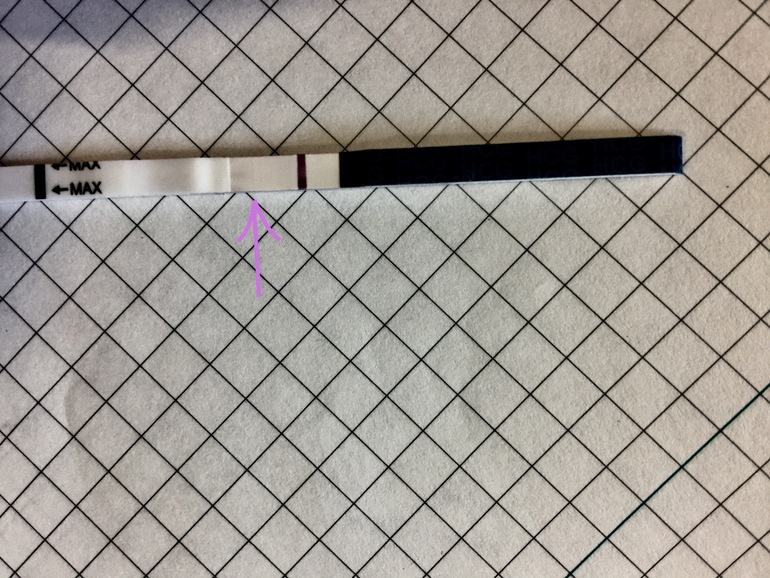 Это не реагент, а полоска,которая не проявилась. Просто в том месте есть полоска, при наличии Б она окрашивается. В вашем случае она не окрасилась. Либо вы не Б, либо рано для тестов.