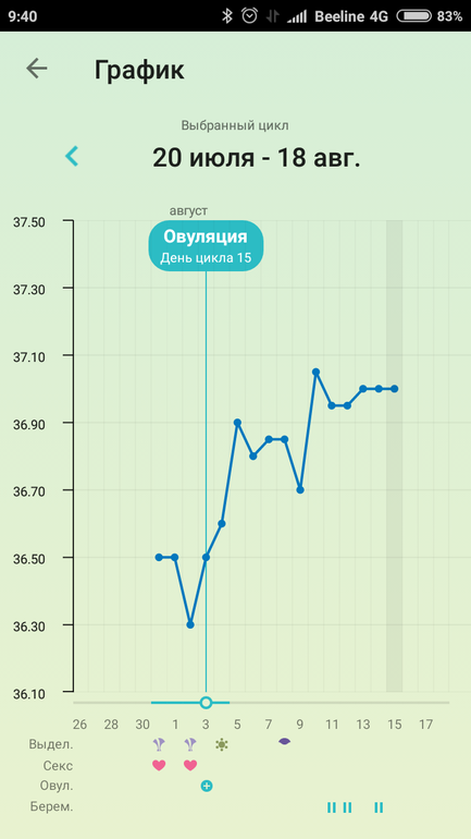 PS. Овуляция на 15 день - по УЗИ определились, что примерно 3 августа, а 15 день - условно, иначе календарь в режим беременности нормально не перевести. Тест на овуляцию до укола ХГЧ тоже ничего не показал путного, а после и не делала, смысла не было. "+" для точности программы поставила. тесты полосатиться реально начали.