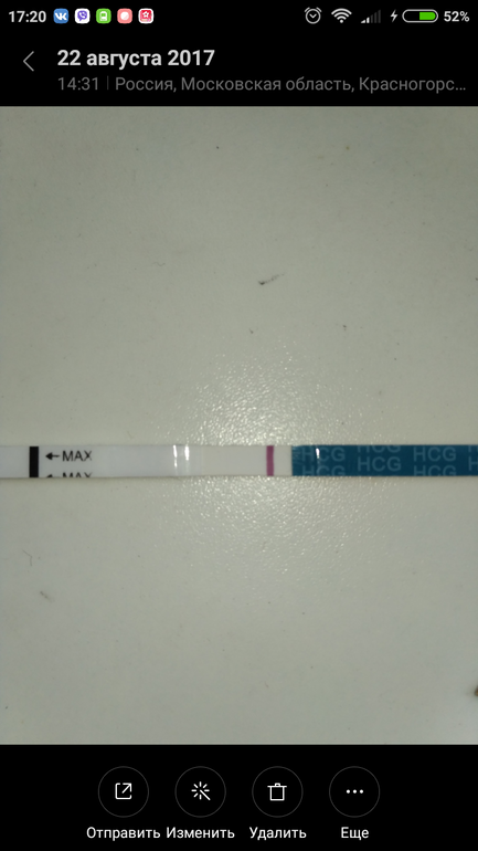 Виднеется. Я в первый день задержки сделала тест на О за неимением теста на беременность и он был положительным. Вечером уже сходила за нужным тестом и увидела свою первую полосочку, не шибко яркую, но не оставляющую сомнений:)