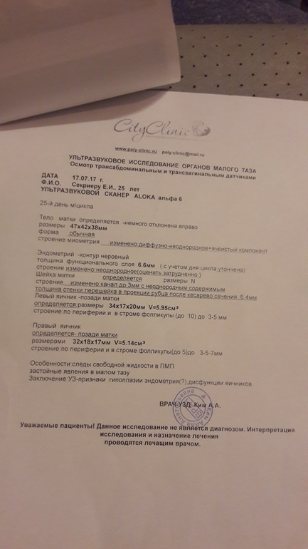 Беременность- 1 триместр ( только до 10 недель)Нашла свое узи,которое делала в этом цикле 17 июля. По узи как видите признаки гипоплазии эндометрия и дисфункция яичников, узи делала после странной мазни,которая была у меня через 2 недели после окончания месячных