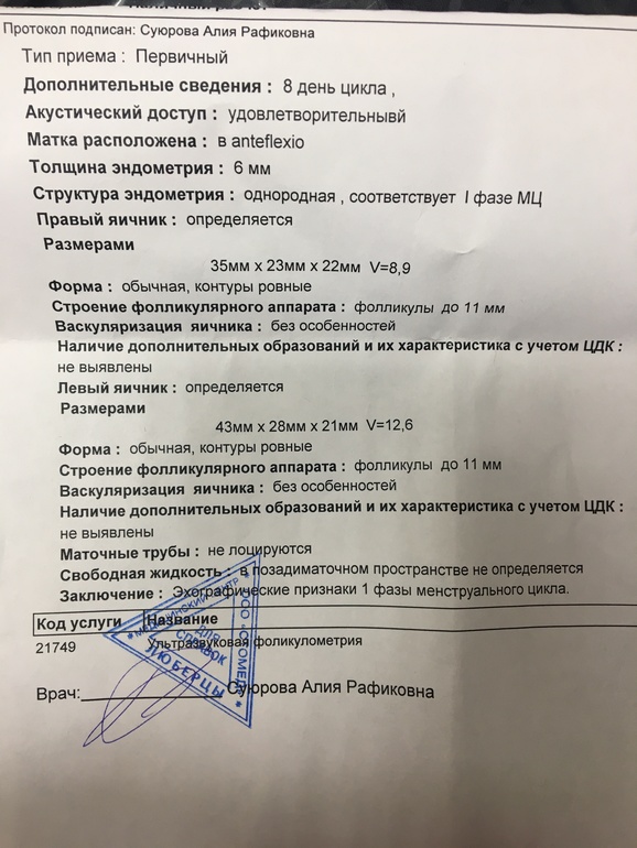 ФолликулометрияПривет, девочки, дождалась я 8 дц и пошла на фолликулометрию. Доктор сказала что никакого мультифолликулоза (который поставил предыдущий доктор) у меня нет. Сказала что в принципе все нормально и следующий мой визит на 11 дц. На всякий выкладываю результаты сюда, гляньте знающие, все нормально?) Может у нас все получится в этот раз?)