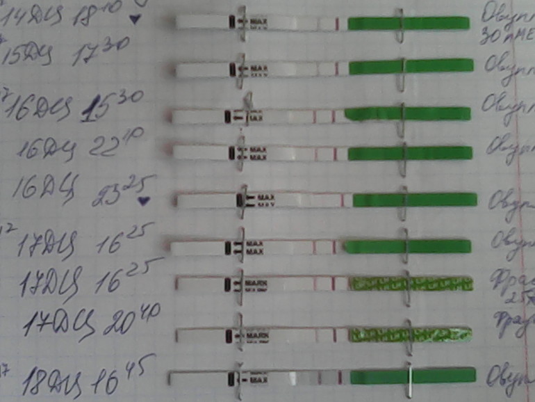 Овуляция( тесты на овуляцию)Девочки, хелп! Я тут новенькая, помогите разобраться с тестами на овуляцию. Очень хотим с мужем маленького!!! Всю себя измучила.... Ситуация такая: в апреле была ВБ, удалили правую трубу, 3 месяца пила ОК, в начале августа сделали повторную лапароскопию, проверили левую трубу - все ок и матка тоже. После лапары еще месяц пропила ОК, как врач прописала. Сказала, можно и нужно беременеть. Теперь с 1 по 15 дни цикла пила Прогинову, а с 16 по 25 день пью Дюфастон. Все по назначению гинеколога. Впервые решила воспользоваться тестами на овуляцию. Теперь места себе не нахожу. Цикл 28-30 дней. С 15 ДЦ до 17ДЦ тянули яичники, болела поясница, выделения и все такое. Чувствую, что вот она... А по тестам выходит, что нет. Сегодня 18 ДЦ, по тестам полоски не такие яркие, как контрольная. С мужем через день стараемся)) Может она все-таки была?? Или на фоне таблеток она еще может быть? Симптомы правда уже меньше. У кого было еще такое? На фото тестики мои, девчонки, помогите разобраться. На 16 ДЦ сначала чуть-чуть бледнее контрольной была, я уже обрадовалась, а вечером опять бледнее, я психанула, сделала еще один, так там вторая полоска вообще еле видна! В общем, извелась вся... и запуталась. Девочки, милые, помогите, разобраться! Всем желанных //