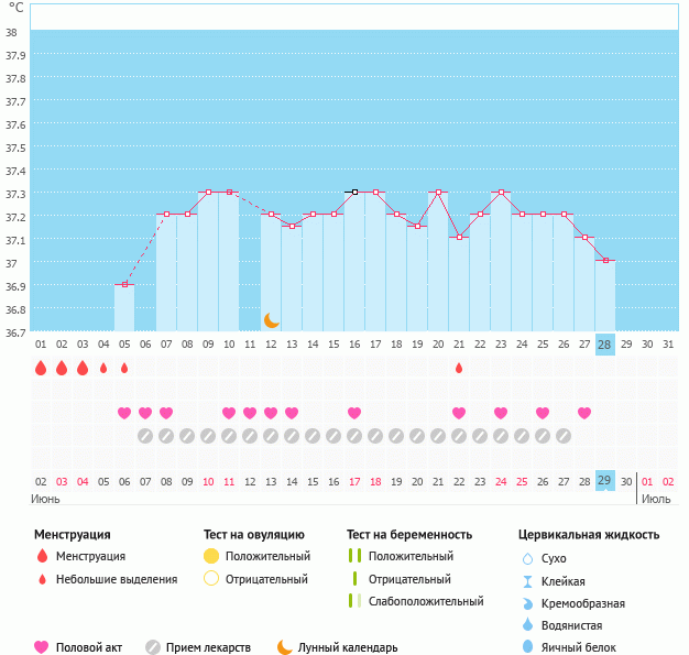 Это мой цикл на "Регулоне". Измеряла тоже из спортивного интереса) Как видите - на фоне приема ОКов темпа поднималась выше 37° с момента приема первой таблетки и держалась весь цикл, а как только я заканчивала принимать эту упаковку, то со следующего дня БТ начинала падать.