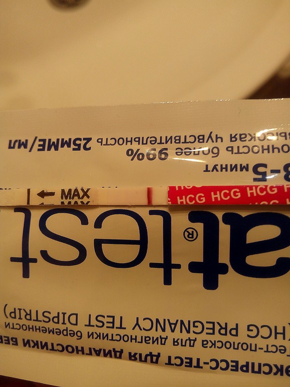 Ждем дня Х (Признаки беременности / Тесты)29 д.ц., по календарю 12дпо, но я не уверена, что О вообще была. Только что сделала тест, меня смущает, что перед розовой полоской, какая-то белая ещё есть, хотя появилась сразу вроде) признаков никаких, да я их и не ищу, даже грудь не болит)) очередной врун?