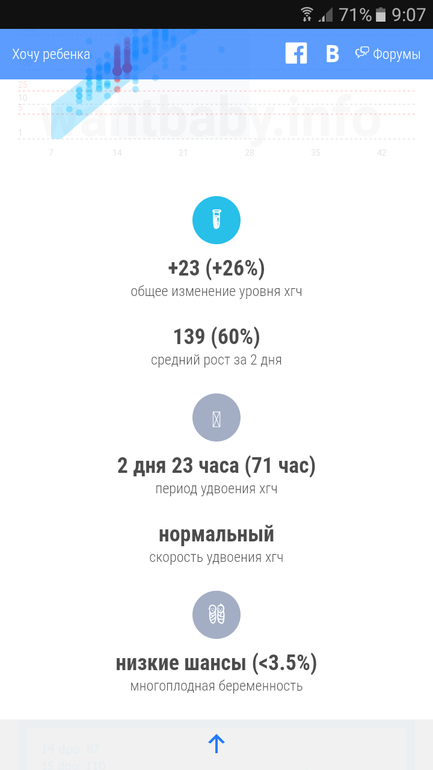 Девочки, у меня сначала ХГЧ росло хорошо, а теперь как-то поменьше стало. Удваивалось меньше чем за двое суток, а в этот раз калькулятор вот что выдал. Период удвоения ХГЧ: 58.5 часов (2 дня и 10.5 часов) Приблизительный рост за 2 дня: 1974 единиц (76.6%) - хороший Вроде и п ишет, что хороший, но мне не нравится. Вот моя динамика: 11 ДПО - 25 15 ДПО - 114 20 ДПО - 1118 24 ДПО - 3487