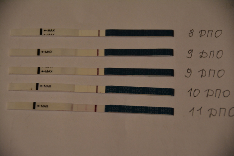 У меня на 8 и 9 ДПО тесты показали серые вмятые полоски, как реагенты, а на 10 ДПО уже розовая была.
