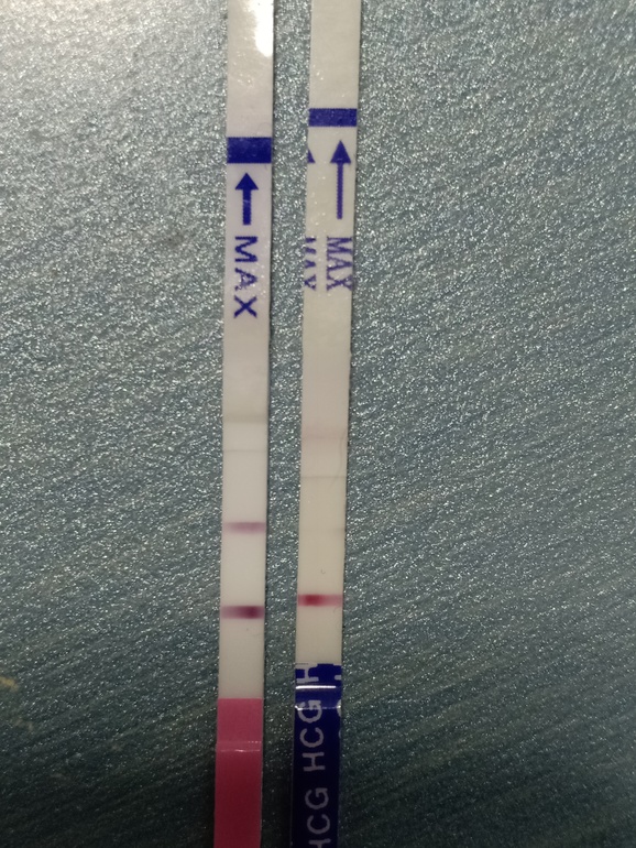 вот и у меня сегодня 25дц ) тест на овуляцию, рядом тест на б )))) но замочила я их вместе и сразу нашла информацию про ползущие полоски))))) пока гуглю, почему такие яркие полоски в конце цикла