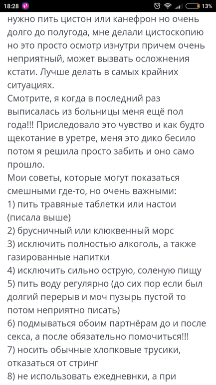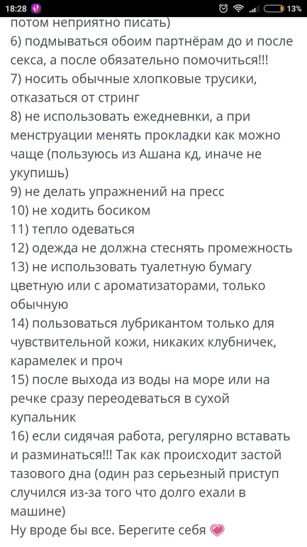 Не знаю, писали ли вы это сами или откуда то взяли инфу,но это советы от человека,который точно знает что такое хронический цистит.. И чтобы прийти к каждому из этих пунктов,мне понадобилось долгих 7 лет(( борьба еще не окончена конечно, но я выполняю все эти условия и мне намного легче. Лучший способ борьбы с хроническим забоолеванием- это профилактика. Отличный пост