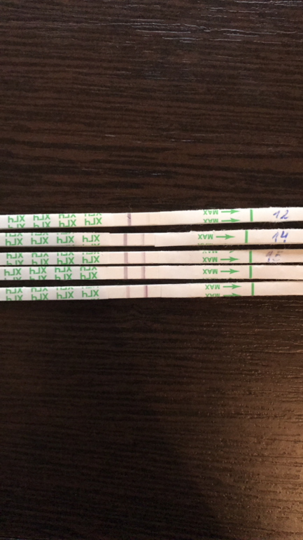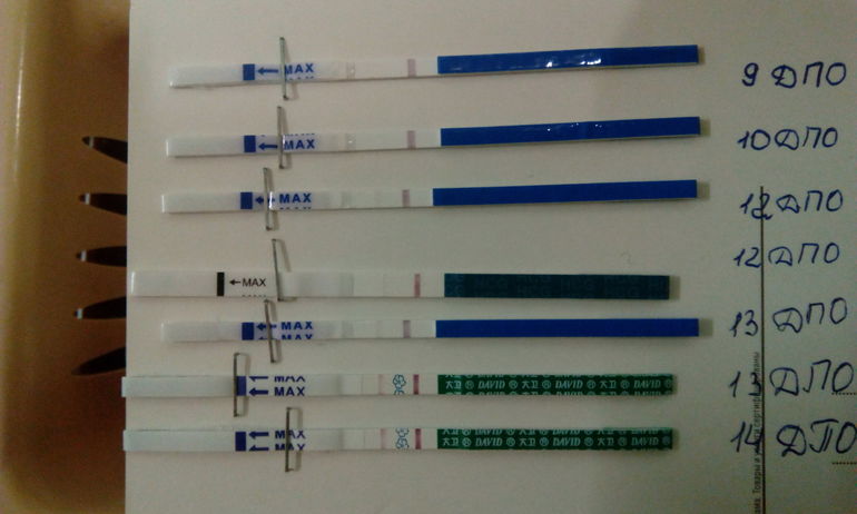 Ахаха, нет ) Я сделала самый первый утром на 9 день после па, там была слабая полосочка, сейчас её уже и не видно, на следующий день сделала 2 теста, они пустые, далее на 11 дппа тоже пусто, впрочем у меня обострилась молочница, поэтому я собиралась к врачу на 12 дппа, утром сделала последний тест и там слабоположитедьный результат, потом до меня дошло, что на 10-ый и 11-ый день я просто делала тесты не на утреннюю мочу, поэтому совсем не видно было ) На 12-ый день после врача я ещё раз переделала тест, далее все по одному тесту в день, с 13 дппа по 24, когда хгч уже перевалил за 4000. Единственное на 20-ый день я сделала два теста, т.к. мне показалось, что первый бледнеет, но они оба посветлее остальных )