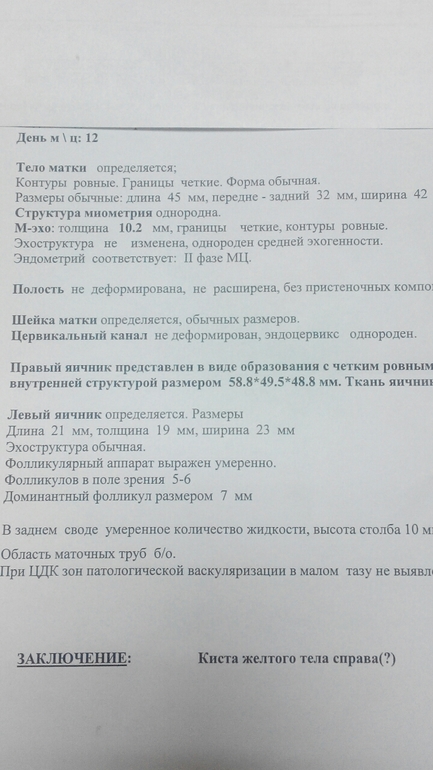 ФолликулометрияДевочки,привет!Сегодня была на УЗИ и теперь совсем расстроилась(((ДФ на 8 дц был уже (!)21мм.Укол ХГЧ в тот же день 10000.Сегодня13 дц и вот такой неутешительный результат(((Вопрос!Жидкость в позадиматочном пространстве есть,значит овуляция все таки была?А если была,то почему киста ЖТ такая большая?Я уже совсем запуталась!