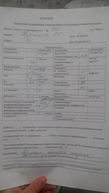 Итак, девчат. Получили мы результат спермограммы. Сдавали повторно, спустя два месяца приема мужем витамина Е, фольки и Спемана. Результат остался на том же уровне. Даже чуть хуже... Патологичных спермиков 97 %!!! Эххххх. А ведь и УЗИ мошонки и яичек в норме, и всякие анализы и кровь сдавал, все в норме. Жду теперь, когда допью 3 недели свою Ярину и у репродуктолога на консультации будем думать, что дальше. У кого есть положительный опыт беременности при таких результатах?