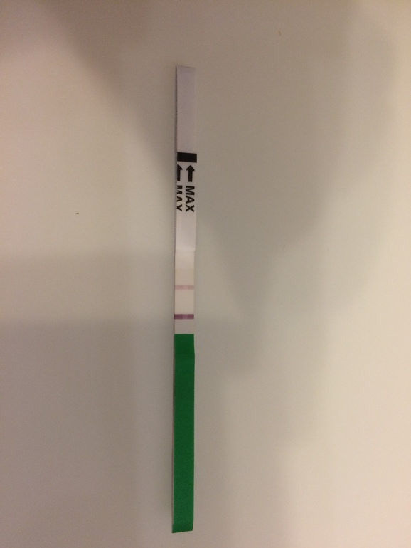 Тест еще негативный, тестовая полоска должна быть такая же яркая или ярче контрольной , у вас пока бледней !
