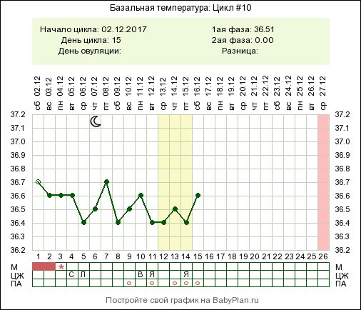 Базальная температура, ТТ, графики БТКак выглядит ановуляторный график? Похож ли мой? цикл обычно 24-27 дней, О всегда на 12-13 день. Сегодня уже 15 ДЦ, каждый день надеюсь, что поднимется темпа, или ищу ощущения, но все никак. ЯБ вроде был, но может я путаю, не знаю как точно он выглядит. Но вчера была слизь. Эх, не видать чуда перед НГ(