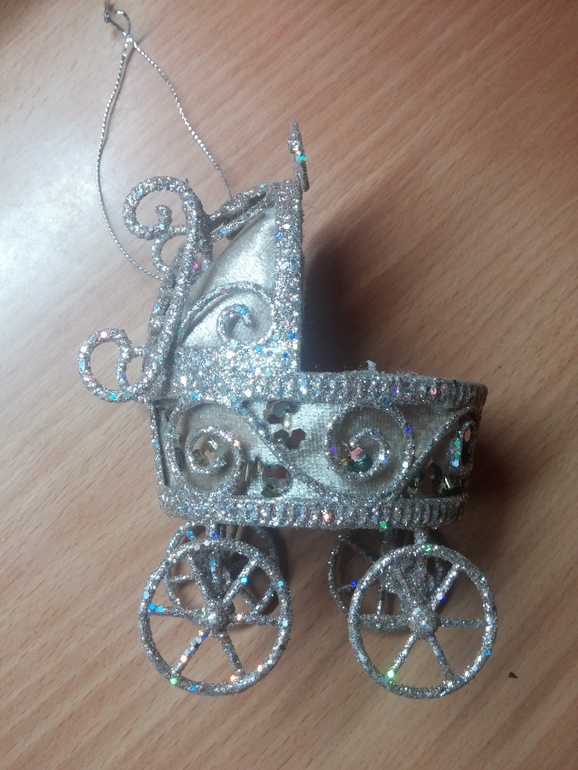 Недавно вычитала тут о такой примете, как пинетки или колясочки на ёлке)) до этого даже не думала что такие игрушки есть)) начала искать, но не находила даже намёка на детскую тематику. И тут с мужем заехали в Ашан, и случайно наткнулась на такую малявочку. Конечно , я ни минуты не раздумывая взяла Ее. Видела кто-то тут из девочек выкладывал совсем офигенную) поэтому значит это не предел для меня в поисках. А пока так