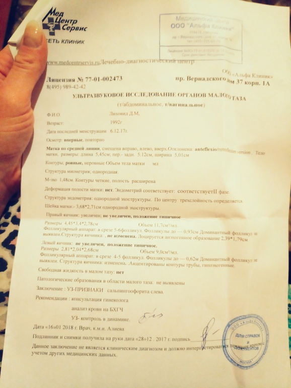 Киста желтого тела в правом. В матке не видит ничего,но увеличина и эндометрий пышный,"шикарный",а вот слева тянет,потому что в трубе воспаление.
