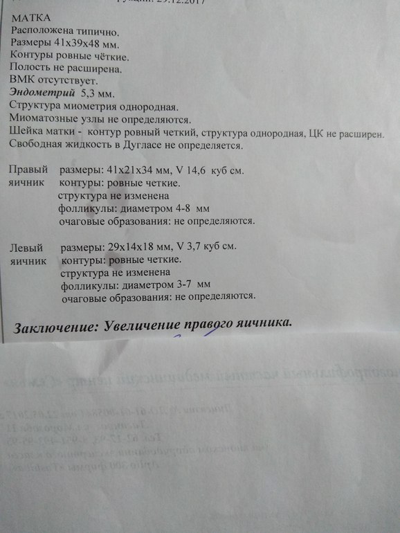 Если есть фото, могу взглянуть. В целом, правый яичник увеличен, но если верить описанию, структура не изменена и фолликулов в нем не больше нормы. Я бы все же проверила гормоны, так как врач и МФя не описывает, и воспаление не описывает, а у Вас уже год планирования. Не вижу желтого тела на 17 день, пока не стала бы назначать дюфастон.