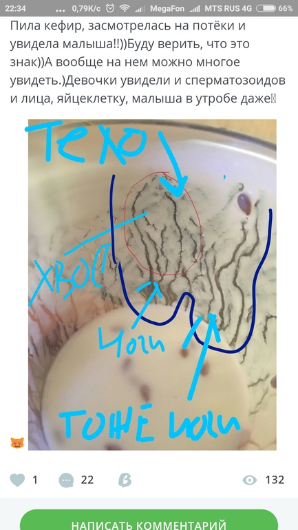Лягухи, аисты, чихи, приметыПила кефир, засмотрелась на потёки и увидела малыша!!))Буду верить, что это знак))А вообще на нем можно многое увидеть.)Девочки увидели и сперматозоидов и лица, яйцеклетку, малыша в утробе даже🤭 😻