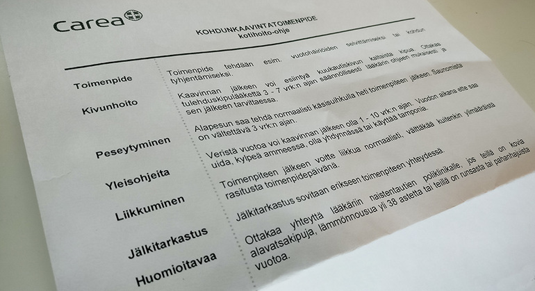 Там мне сказали, что давление низкое и гемоглобин упал до 78. Мне было холодно, немели руки и ноги. Из того, что я поняла, мне поставили капельницу с антибиотиком, если правильно запомнила - ципрофлоксацин (Siprofloksasiini). Остальные - не знаю. Начали подключать другие датчики, но из-за низкого давления не все данные показывали и пришлось ставить катетер в артериальную вену. Молодой человек сначала попробовал на левой руке - не вышло. На правой получилось, но медперсонал над ним посмеялся, т.к. моя кровь забрызгала поручни каталки. Я помню, что был еще один приступ удушья и мне снова говорили сосредотачиваться на дыхании, вдыхать через нос, выдыхать через рот. Персонал работал очень слажено. Пришла та же врач-гинеколог, сказала, что по результату УЗИ они определят, нужна абразия (kohdunkaavinta) или нет. Сделав мне УЗИ, она стала звонить в операционную и я слышала, что она говорила про анэмбрионию (tuulimuna), гематому (hematooma) и переливание крови (punasolusiirto). Пока я ждала операционную, мне хотелось спать. Периодически меня спрашивали, в сознании ли я, т.к. я закрывала глаза. Вообще, медперсонал был хороший, время от времени все шутили и не давали скучать. Та же врач-гинеколог сказала, что в меня нужно "залить" еще несколько жидкостей. Мы ждали, когда подготовят операционную. В какой-то момент весь персонал разошелся и осталась только одна медсестра, которая все данные вносила в компьютер. Тут мне стало снова плохо и меня снова начало рвать. Мне ввели препарат для подавления плохого состояния. Гемоглобин упал до 70 и кто-то звонил в операционную и говорил, что ждать больше нельзя. Привезли в операционную, помогли перелечь на операционный стол. На ноги одели какие-то мешочки, которые должны были греть мои ноги, но я так сильно замерзла, что меня начало трясти от холода. На меня положили согревающие одеяла, но согреться я не могла. Дальше я помню маску, которую положили на лицо и сказали глубоко вдыхать.