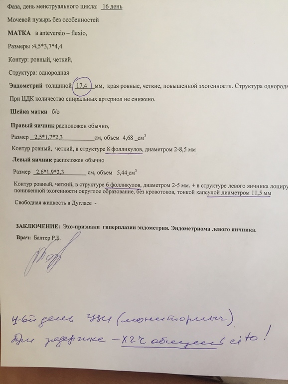 Легла, узистка начала смотреть и сразу говорит, ты вроде беременна!!!! Мои слова, я конечно буду очень рада, но наверно это невозможно... я тут по-поводу бесплодия... она говорит у тебя эндометрий островат, это возможность беременности, купи сегодня дорогой тест и сделай!!! На что я ответила, что сомневаюсь, что на 16 дц тест что то покажет. Про себя думаю, блин может смена климата, отдых и правда что то изменил.... ну тут мои мысли отпали, так как она начала говорить, что скорее всего овуляции небыло... в левом яичнике лоцируется пониженной эхогенности округлое образование тонкой капсулой диаметром 11,5 мм. Эндомерий толщиной аж 17,4 мм!!!!!!!! Заключение: эхо-признаки гиперплазии эндометрий. Эндометриома левого яичника. Я следом пошла обратно к врачу, показала ей УЗИ, она меня ждала.... говорит, что беременности не будем исключать, но эндометрий на 16 дц очень большой, обозначила что фолликул много - это хорошо при моем АМГ!