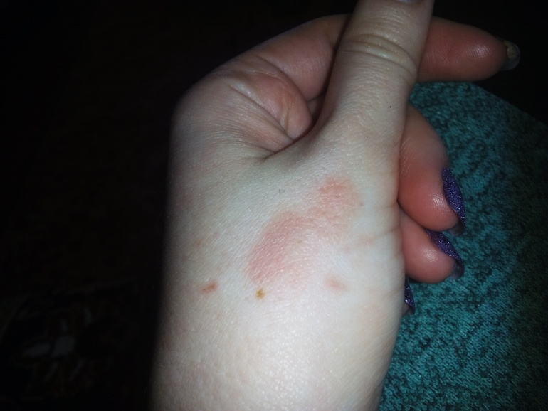 На химию может быть! Я сегодня на работе такое пятно заработала при контакие с раствором. Зажгло, промыла водой а там точь-в-точь такое же пятно осталось..как ожег выглядит. Сейчас и на порошки и мыло может такое быть. Ну и не исключена аллергия пищевая. Вспоминайте что такое ели последнее время. Пищевая обычно на коже проявляется спустя время, после того как аллерген накопится. Либо сразу, если организм среагировал моментально.