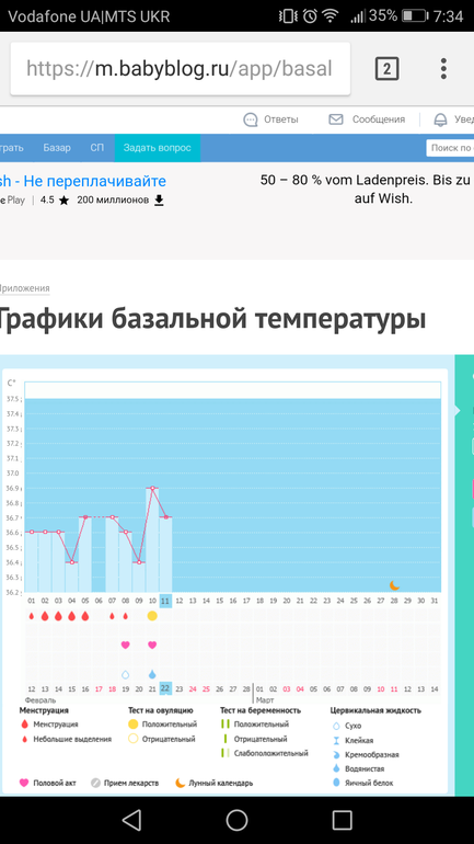 А вот график бт. Сегодня немного упала. Но судя по двум прошлым моим графикам, то температура у меня скачет туда сюда, потому что прогестерон в лютеиновой фазе как в фолликулярной. Поэтому с этого месяца назначена поддержка. Но первая фаза в этом цикле все равно более менее ровная .