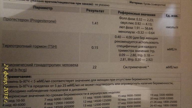 Замершая беременностьДевушки, ситуация для меня странная. Вобщем на 13 ДЦ было узи. Эндометрит 5,7 ДФ 14мм. Делала тесты на овуляцию. На 16 ДЦ он поярчал, но на 17 уже был бледнее. Я так и не дождавшись положительного результата забросила их. На 18 и 19ДЦ был ПА. Муж уехал, вернулся на 28 ДЦ. На 33 ДЦ сделала первый тест на беременность (так как был первый день задержки) и увидела очень слабую полоску. На 34, 35 и 36 ДЦ делала тесты. Полоска была такая же слабая и ярче не становилась. На 36 ДЦ сдала кровь на ХГЧ, прогестерон и ТТГ. Утром на 37 ДЦ пришли месячные. Днем получила результаты анализа. ХГЧ 22, прогестерон 1,41, ТТГ 0,15. Ну я решила, что для такой задержки ХГЧ слишком мал и прогестерон ни о чём вообще. Видимо уже пошли на спад как при БХБ. Анализ повторно сдавать не стала. Месячные идут как обычно, но немного больнее. И черт дернул замочить последний тест сегодня, на третий день месячных...А он положительный, и полоска хоть и бледнее, чем контрольная, но намного ярче предыдущих тестов. Что это может быть вообще? К врачу в четверг пойду разбираться...