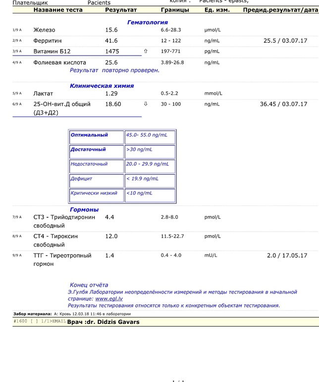 А я не перепроверяла, потому что, как уже писала, толком и не принимала, только периодически. Он у меня в пределах нормы, а когда витамины выписывали, на него и не глянули, по одной генетической склонности назначение сделали. А ведь нужно ещё диету учитывать. На вас смотрю, и понимаю, что рассуждения были логичны. Будет 2 полоски - пересдам. А то ещё неизвестно, сколько не будет получаться - угроблю здоровые органы, пока настоящую проблему найдут. Только теперь, наверно ещё добавлю анализ на витамины.