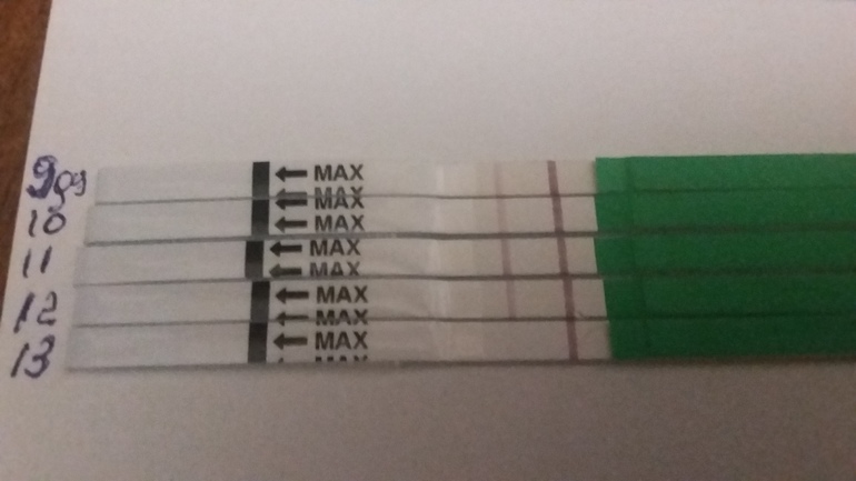 Овуляция( тесты на овуляцию)Всем привет! Первый раз делаю тесты на овуляцию. Прочитала здесь, что положительный тест - это когда вторая полоска такая же яркая как контрольная, или ещё ярче. Цикл в среднем 30 дней. Начала делать тесты с 13 ДЦ, и вот что получилось. (Фото ниже)