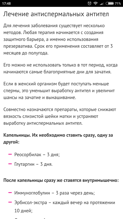 Читаю многих. Не помню у кого, кто то писал про АСАТ (антиспермальные антитела). Так вот, заморочилась, почитала и наткнулась прям на откровение. Об этом чуть позже. Хочу проконсультироваться с врачом. Есть проба Шуварского или посткоитальный тест. Нашла еще для себя Центр иммунологии и репродукции. Там делают этот анализ. Просто для меня удивительно, у двух здоровых молодых людей не получается... Есть еще иммунологический фактор бесплодия. Не знаю, как вы, но мы с мужем вообще "не вытаскиваем". Все половые акты заканчиваются в меня. Прошу прощения за подробности. Теперь откровение. В статье сказано, что сперма и в мужском и женском организме это чужеродный белок. Так вот, как с аллергеном, чем чаще этот белок поступает в организм, тем больше антител к нему вырабатывается. А значит, организм будет от него избавляться. Поэтому, всем планирующим, рекомендуется заканчивать па во внутрь, только в фертильные дни. Мне почему то, эта мысль в голову не приходила. Хочу теперь проверить на себе. У нас достаточно большой перерыв, потому что предохранялись перед операцией, и сейчас, пока заживаю. Как то так. Надеюсь, кому то будет полезно и интересно. Ниже прикреплю скрин экрана с кусочком из этой статьи. Может я очень сумбурно написала.
