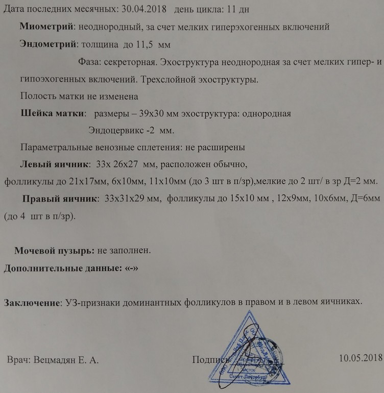 БТ в первой фазе 38.8??? Как такое может быть.... А что у вас с гормонами? По мне так все как то необычно в вашем заключении, эндометрий толстоват для 11дц, и ДФ больше уже кисты по размерам...