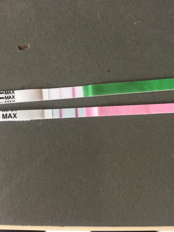 фото верхнее зеленый тест и фото нижнее розовый тест ОНО, на среднем фото ЛГ падает, срочно ПА