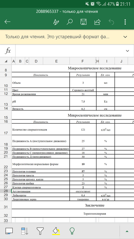 У нас из лаборатории прям результаты просто огонь были. А после клиники тоже поставили тератозооспермию. Но у меня ещё во мне проблема, поэтому мы не стали ждать, да и возраст 33 года.