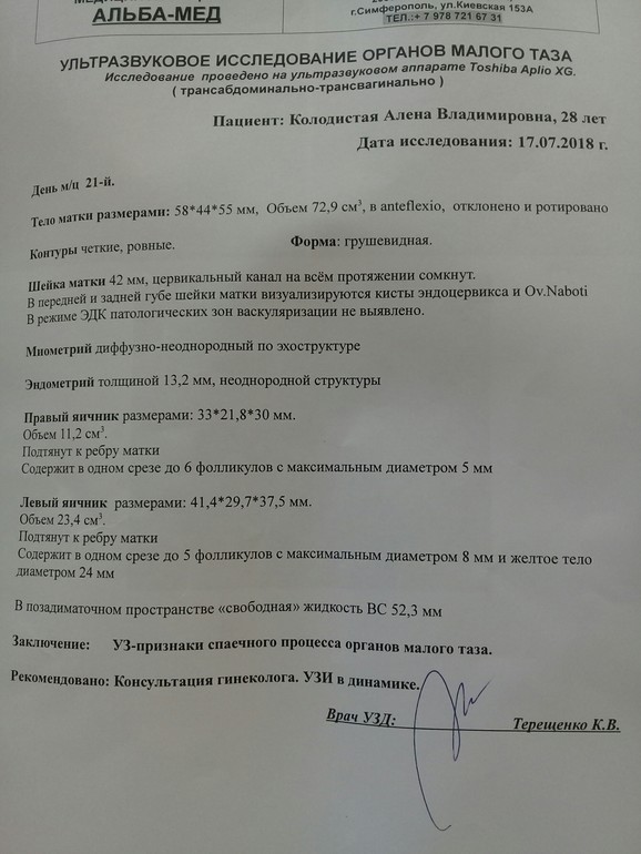 ФолликулометрияКто разбирается посмотрите пожалуйста УЗИ!!!Сестра не может забеременеть, сходила на УЗИ но к врачу не попала, расшифруйте пожалуйста!!! Не пойму что за желтое тело, оно же при беременности только бывает или нет???Кисты ещё какие то...и что за спаечный процесс??