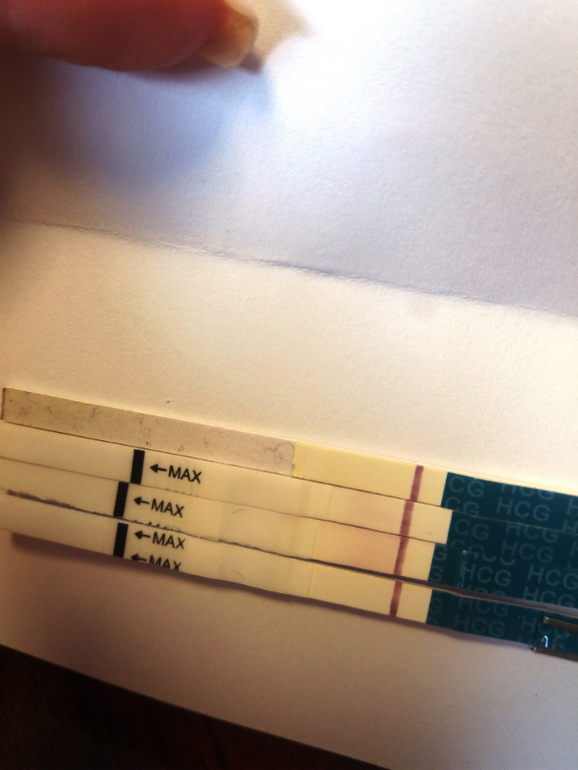 Два по середине - сегодня 13 дпо. Оба размытые вместо "беременной" полоски. Делала тесты один за другим, так как подумала что брак, но второй оказался такой же.