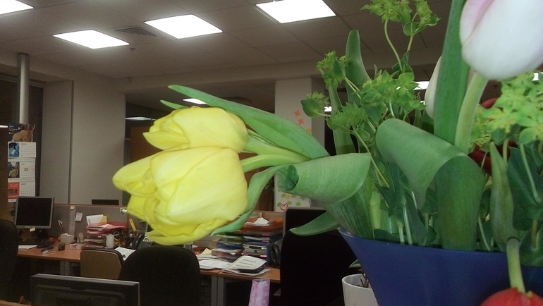 У нас на работе на 8 марта дарили букеты тюльнов. Мне попался с двойным цветком. В том же месяце заб. Удачи вам.