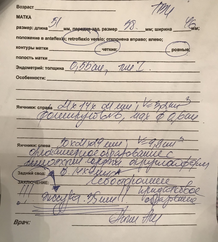 P.S. Если кому не понятно: в левом яичнике однокамерное образование с гипоэхогенным содержимым округлой формы.