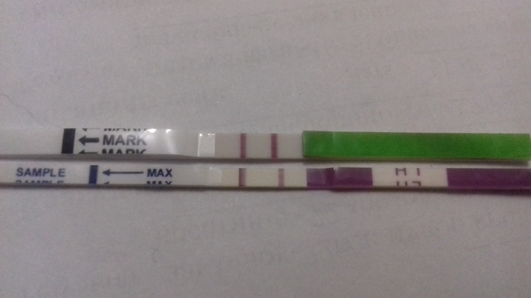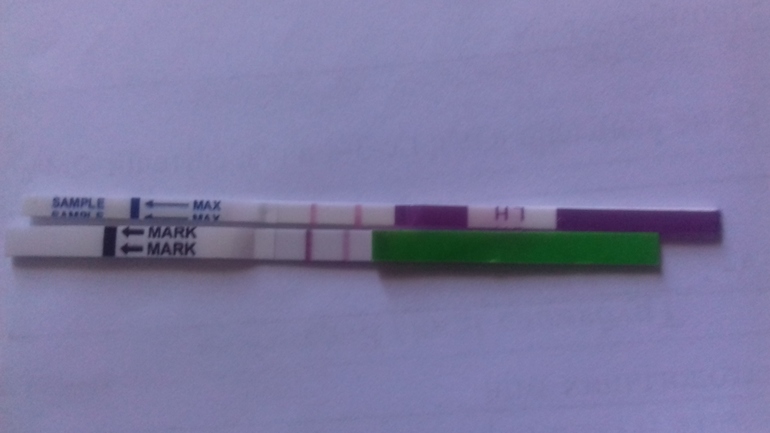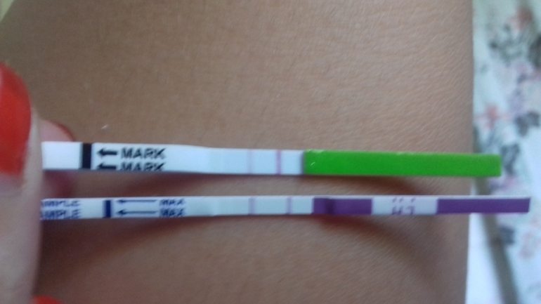 потом ПА, но за 10 мин пришлось вставать и ехать, у мене всегда О с 13-17дц, я решила делать по 2 разных теста в одну жидкость, всегда делала фиолетовые тесты и О была в день положительного теста.
