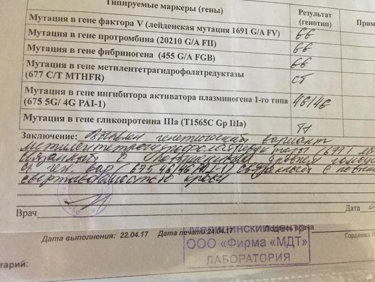 Да , я сдала на тромбофилию, и у меня есть кое- какие нарушения , об этом был пост ну большинство гинекологов и гематологов уверены что причины не в этом.