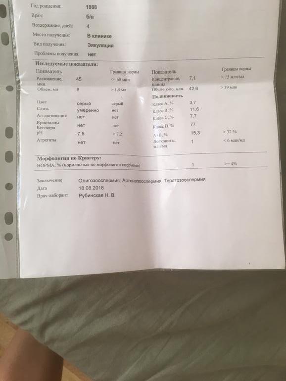 Хорошо подвижных всего 3,7% это очень мало (у первого мужа было 4%). И еще в анализе не указано (или я не вижу, может тоже как зашифровали) сколько морфологически нормальных, а сколько с дефектами.