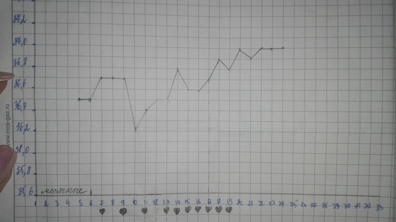 Базальная температура, ТТ, графики БТВсем привет! Ситуация такая: это мой первый график, тест на овуляцию делала, но так и не поймала, были в отпуске, как по Вашему, была овуляция и на какой день? Всем спасибо за ответ.