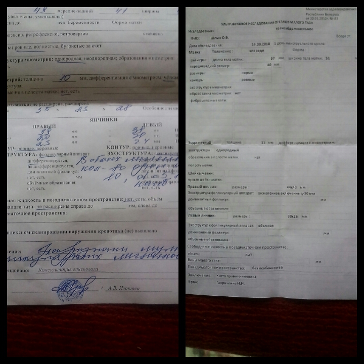 Последние м были 18.07 - все как надо.этот цикл оказался авуляторным.( бывает)цикл не стабильный,но не суть.ждала м ...44 дц их нет.поход к гине ,УЗИ,анализы--вме в норме.ждите !!! Вот вот придут.эндометрий 10.на вых на 54 дц( или 1 дц. Хз как считать) пришли.радости не было придела.пришли родненькие.но не тут то было.помазали и ушли.думала разойдуться,но нет.на 3 дц сходила на Узи ,чего за фигня происходит .эндик 14 уже.рассказываю картину:- подождите ещё разойдуться,так бывает.ну ок жду.и ничего.сегодня чет не понятное.такого раньше не было. М как таковых и нет.завтра снова поход в жк,на разборки:).уже засыпала и вспомнила: я ж начале августа лежала с чмт.могут ли быть от этого последствия? Можно ли как то счас заставить поработать организм,что б была хорошая овуля,на таком эндике забеременеть? Голова кругом.завтра к врачу,но до утра далеко.у кого - нить так было? Смогли забеременеть? Через сколько?спасибо девочки,что вы есть!!!сходила к гинекологу.отправила на Узи+ завтра с тестом к ней.сходила на УЗИ и вот вам и пожалуйста: киста яичника,матка увеличена,мазня переодично ,но не сильно кремового цвета.тесты пусты! Девочки ,что за хрень то со мной происходит.фото Узи одного цикла с разницой в 15 дней.