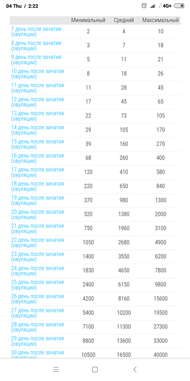 Мне гинеколог сказала в Первый день задержки должен быть не меньше 1000, а у меня по её цифрам отставание было (было 698). Знатно перепугалась. Но оказалось зря.