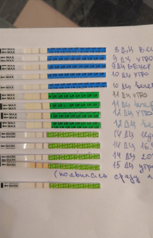 Вот мои фрау( все зелёные) на О в этом цикле, на 15 ДЦ сразу яркая полоска, прямо вырви глаз)). Думаю у Вас тесты пока отрицательные.